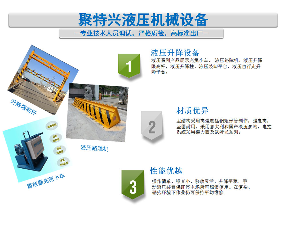 走進聚特興enter hengya濟南聚特興機械設備有限公司是專業從事液壓升降限高桿、液壓路障機、蓄能器充氮小車、升降柱、扎胎器、裝卸平臺的研發、設計、生產銷售及服務生產廠家。產品遍及工礦企業、倉庫貨站、高速公路、高樓清洗、維修、物流倉儲、通信、機場、港口裝運等領域。根據客戶的要求非標定做自動化設備,解決客戶人工成本高、從而幫助客戶提高市場核心競爭力。公司憑借雄厚的技術實力和強大的研發能力,新動力公司多年年來已經為數十家五百強企業提供配套產品及服務,并得到客戶一致的認可.....